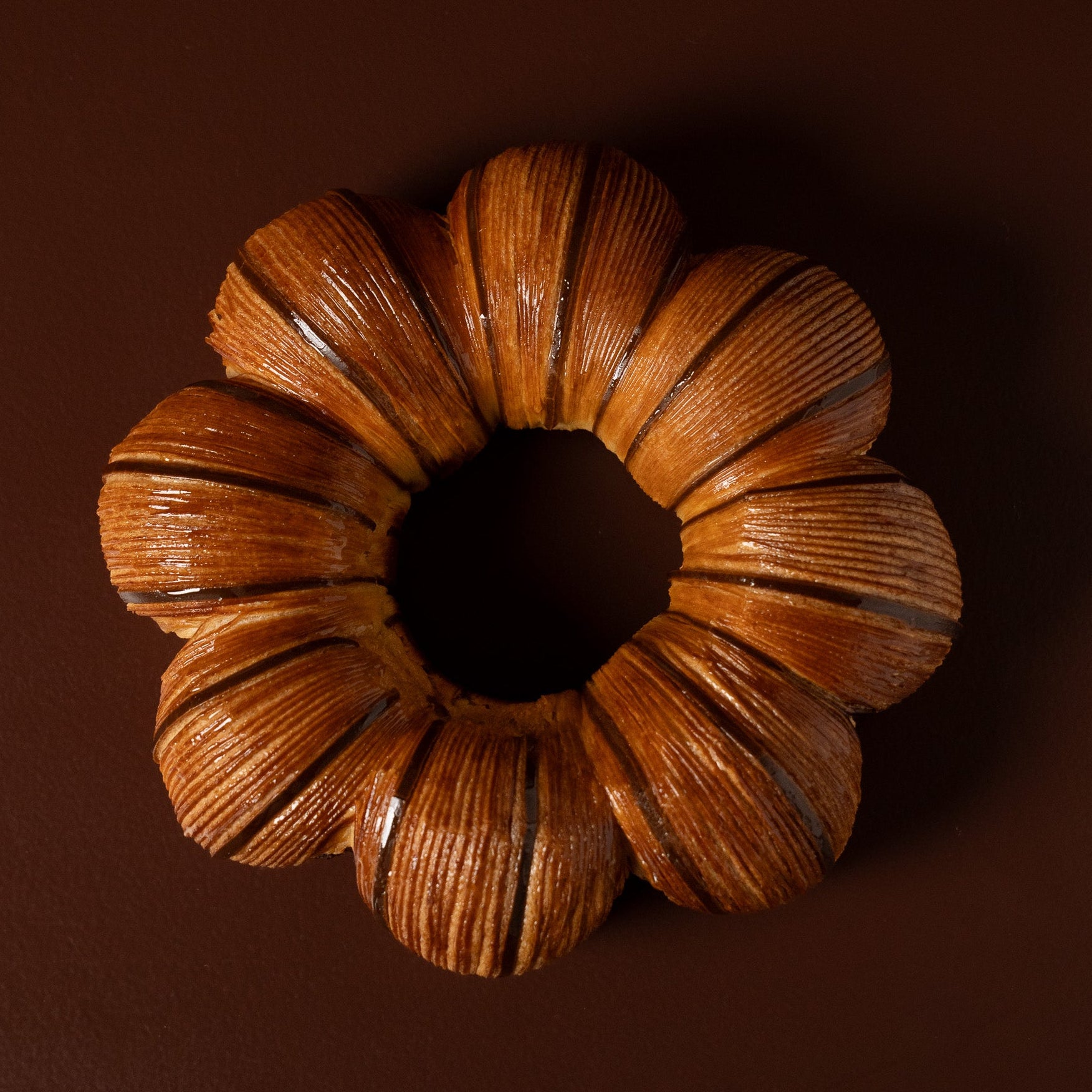 Rosca suisse de crema pastelera de chocolate, chips de chocolate y dulce de leche.